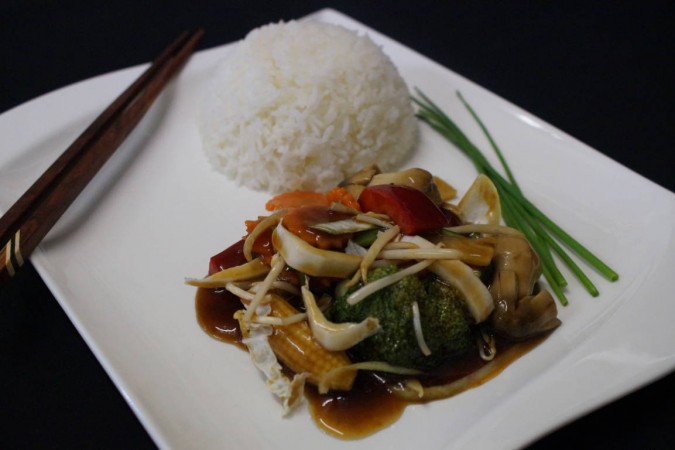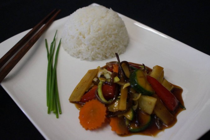 Das Gericht aus dem heissen Wok für Gemüseliebhaber, garniert mit einer Portion gedämpftem Reis