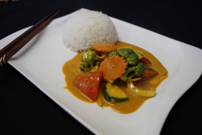 Würziges Thai-Curry an Kokosmilch mit Karotten, Bambus, Zuchetti, Zwiebeln, Pepperoni und Broccoli