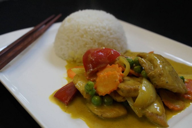 Gelber Kokoscurry mit Poulet, Karotten, Zwiebel, Erbsen, Zucchetti und Peperoni. Serviert mit gedämpftem Jasminreis