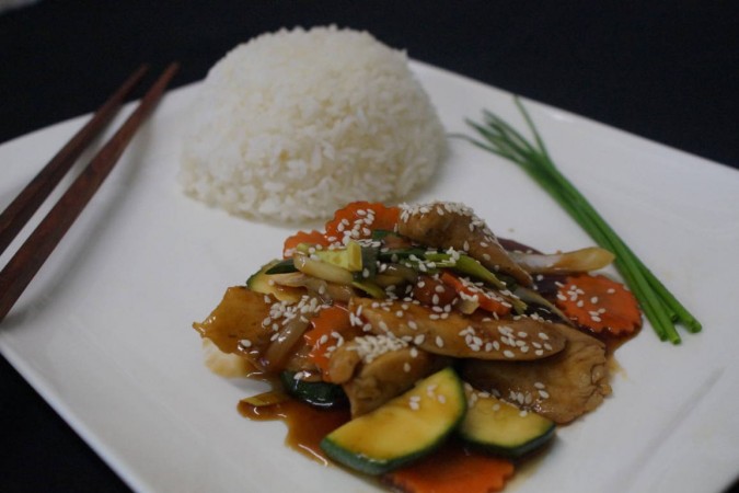 Chinesisches Barbecuegericht mit Poulet, Karotten, Zwiebel, Peperoni, Zucchetti und Lauch. Serviert mit gedämpftem Jasminreis