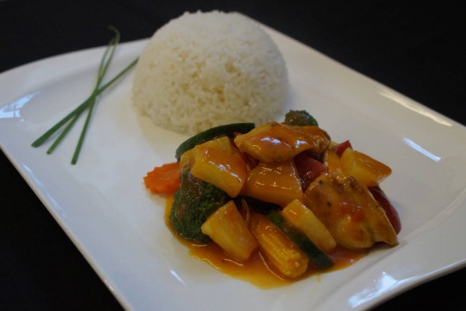 Süss-Saueres Pouletgericht mit Karotten, Babymais, Zwiebel, Peperoni und Zucchetti. Serviert mit gedämpftem Jasminreis