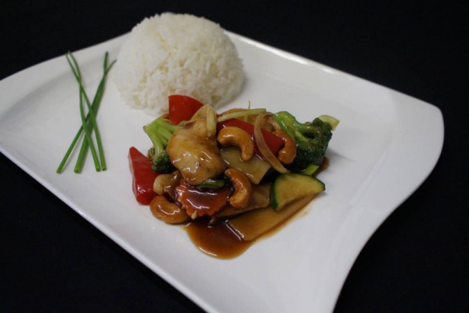Chinesisches Pouletgericht mit Kernelnüssen, Bambussprossen, Babymais, Zwiebel, Peperoni und Zucchetti. Serviert mit gedämpftem Jasminreis