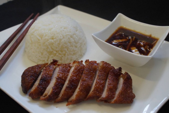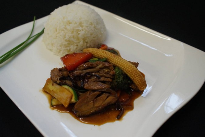 Marinierte Entenbrust an einer kantonesischen Sauce. Serviert mit gedämpftem Jasminreis