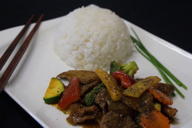 Rindfleisch an Pfeffersauce mit Bambussprossen, Babymais, Zwiebel, Peperoni, Zucchetti und Lauch. Serviert mit gedämpftem Jasminreis