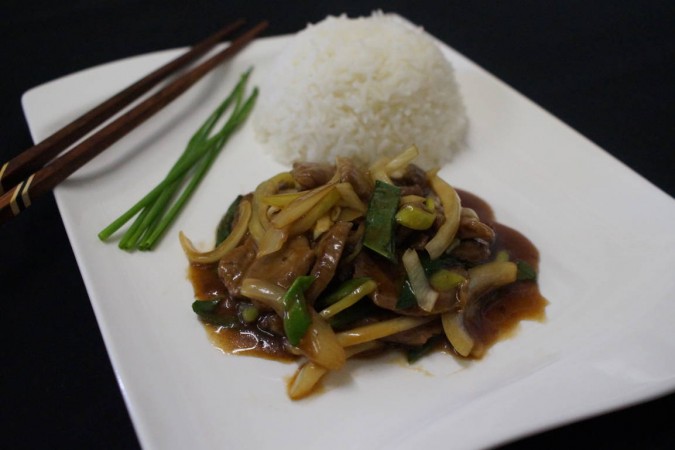 Rindfleisch an Austernsauce mit glasierten Zwiebeln und Lauch. Serviert mit gedämpftem Jasminreis