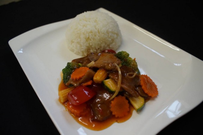 Rindfleisch an Süss-Scharfersauce mit Karotten, Babymais, Zwiebel, Peperoni und Zucchetti. Serviert mit gedämpftem Jasminreis