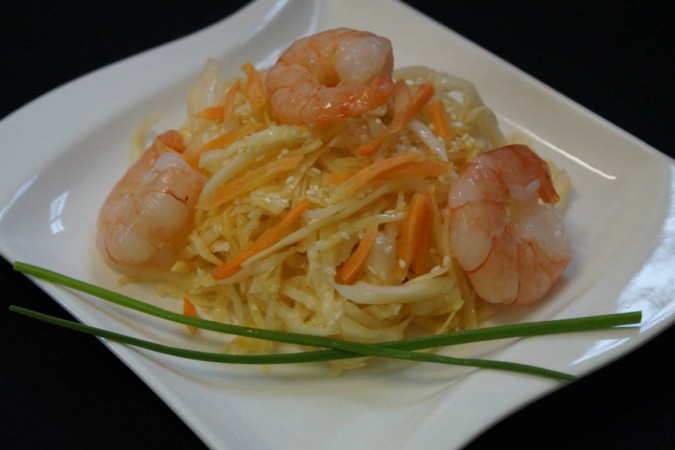 Scharfer Weisskabissalat mit Crevetten und Chilidressing