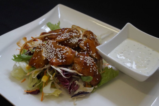 Bunter Blattsalat mit Karotten und Mais mit glasierten Pouletstreifen serviert mit französischer Sauce